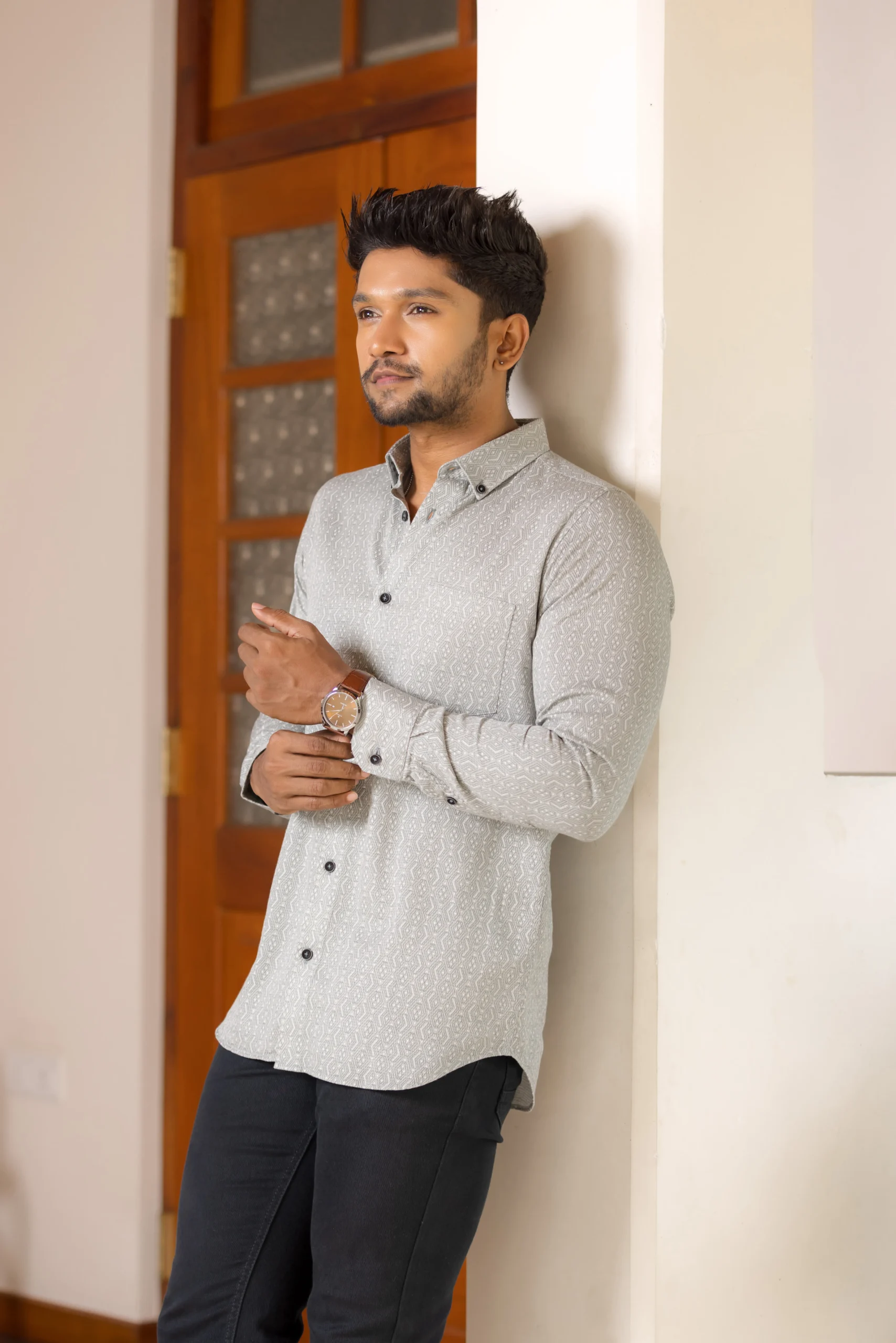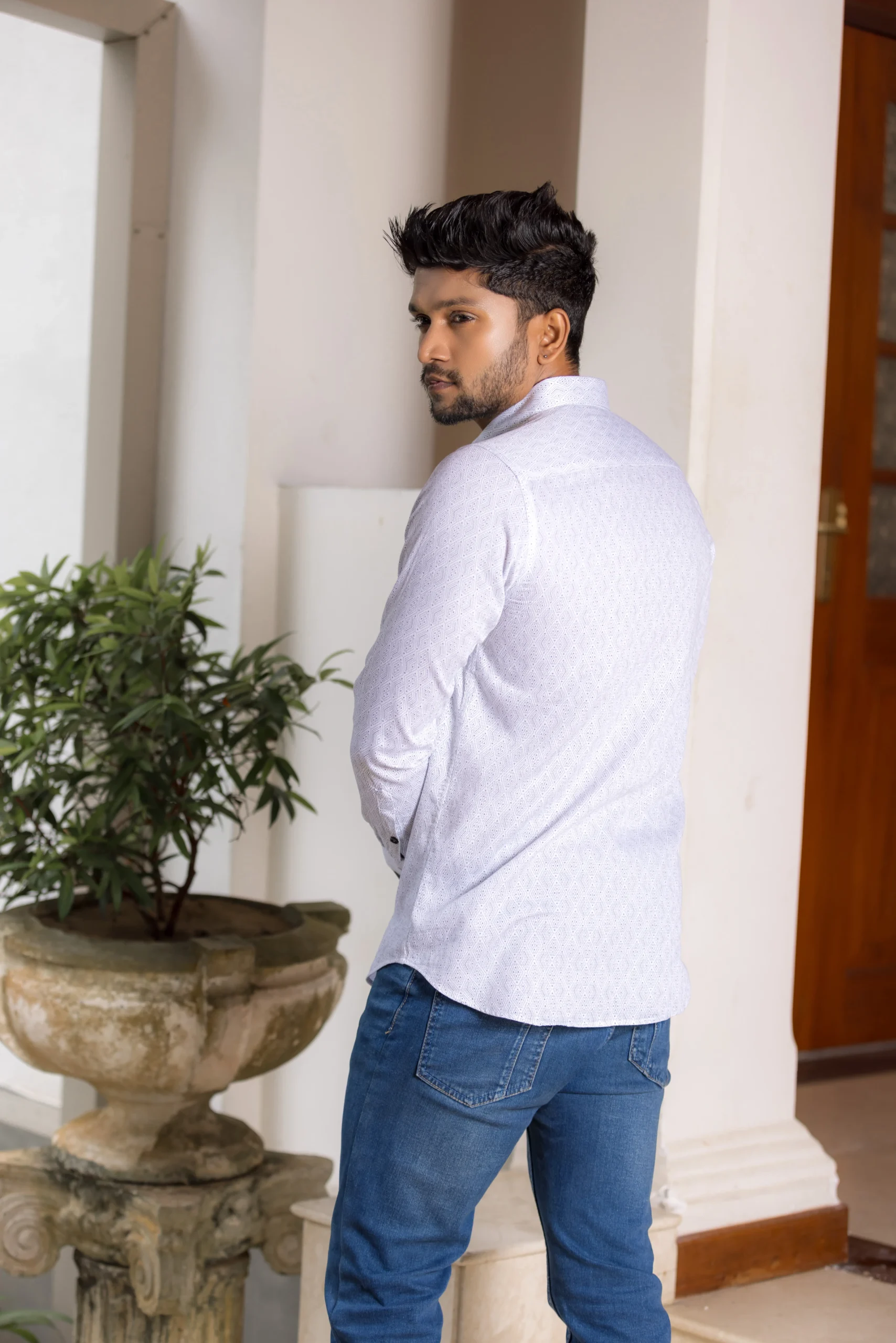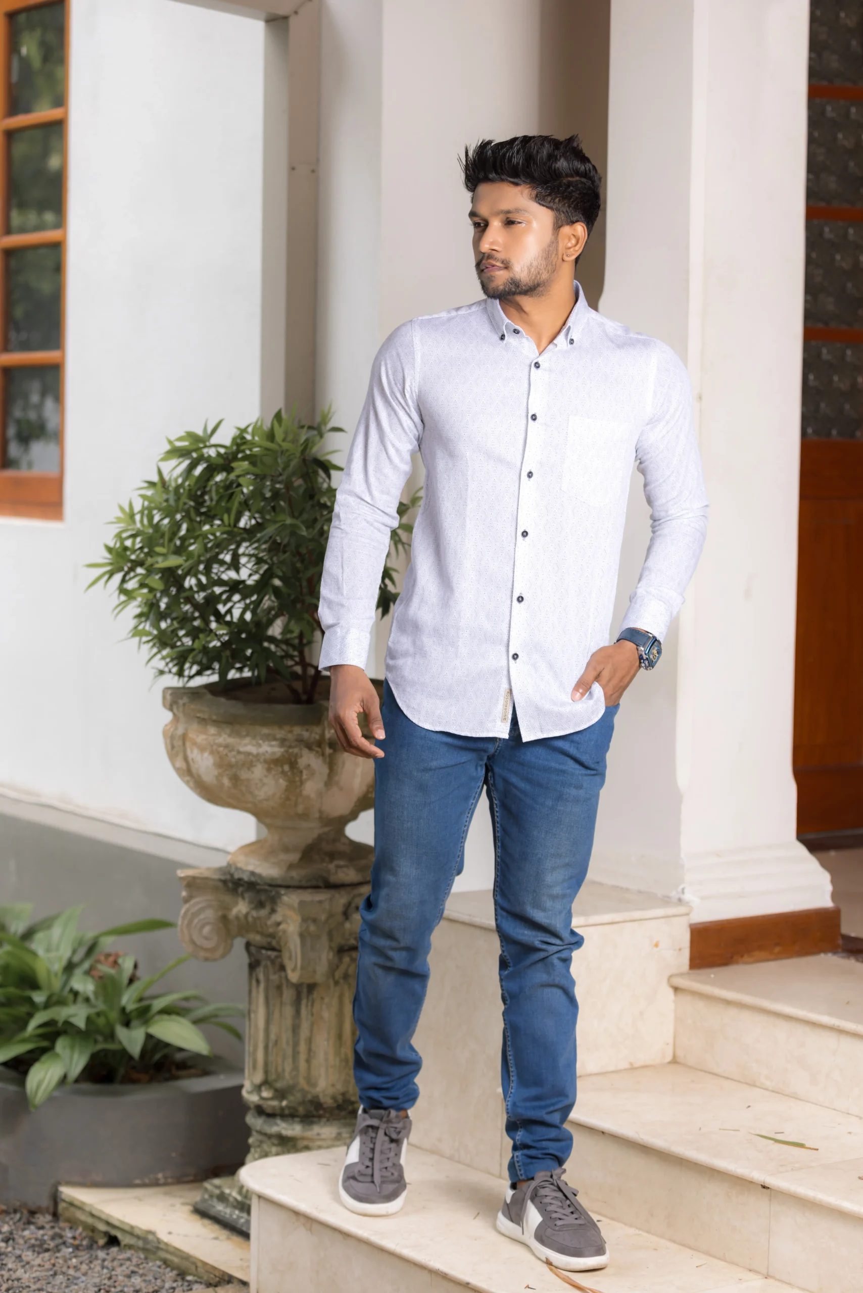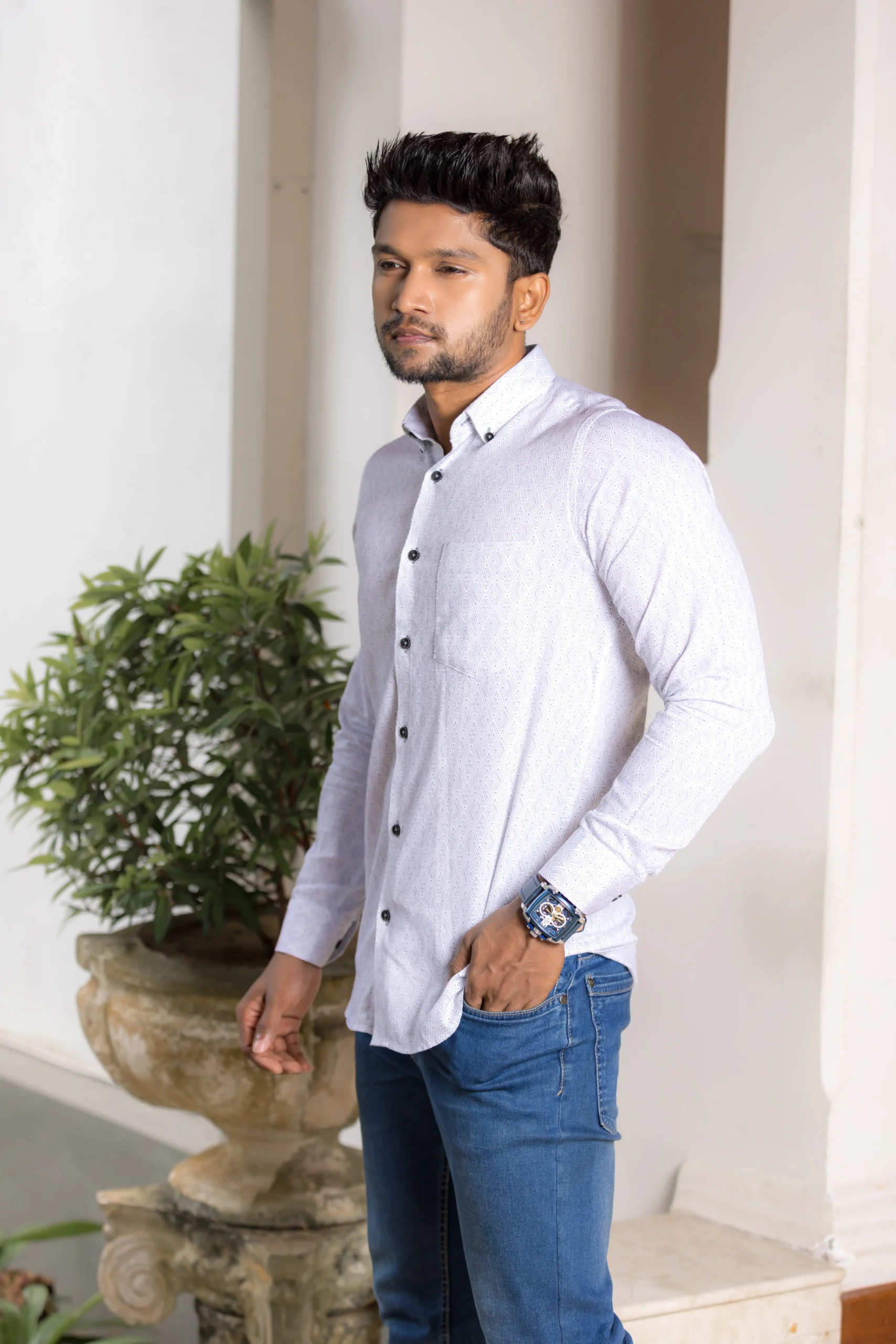 Intricately detailed and beautifully minimal, Giorhudson’s Diamond Weave Luxe Shirt is designed for the man of quiet confidence. The fine geometric texture and crisp white tone make it an elegant choice for refined evenings or smart casual looks.