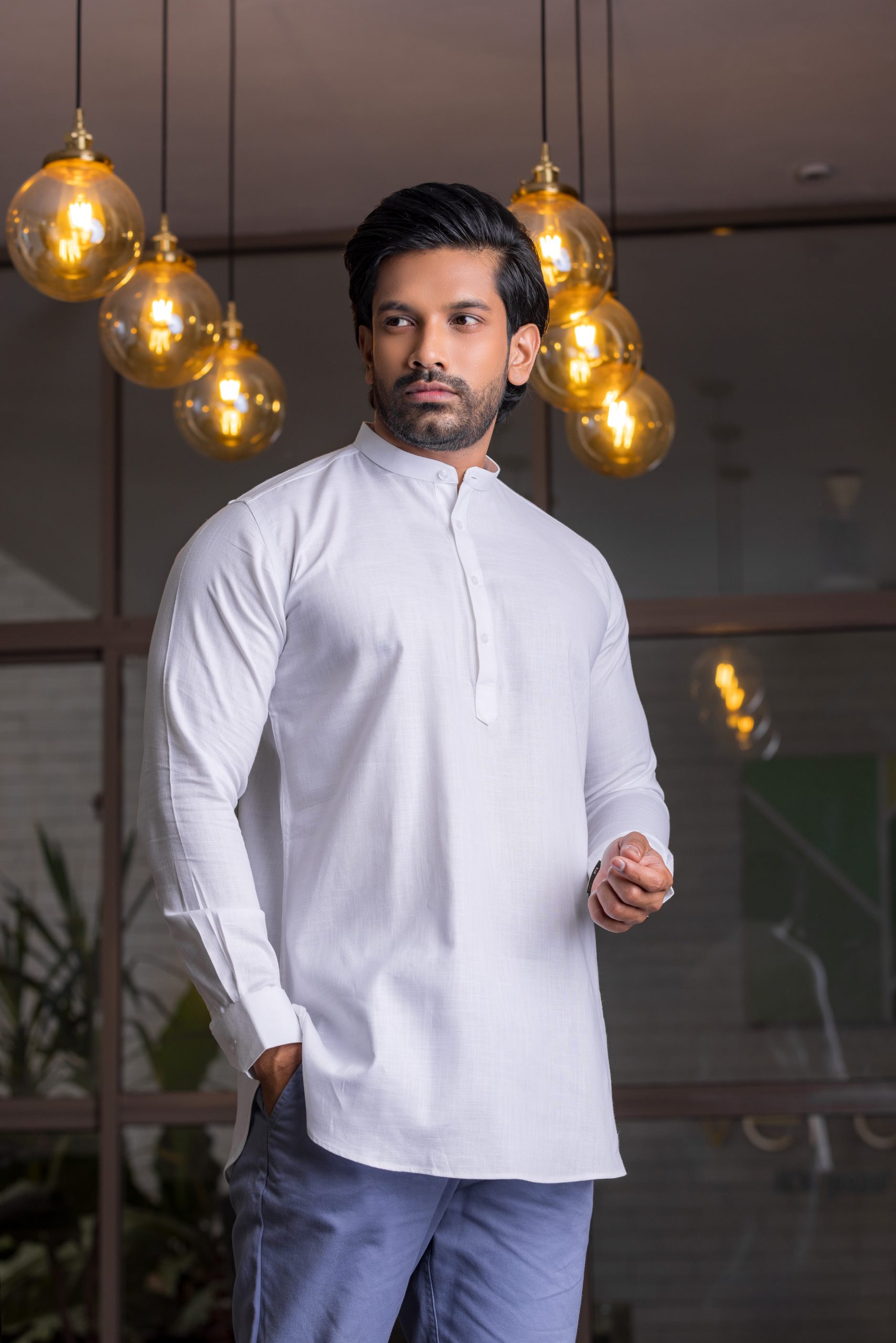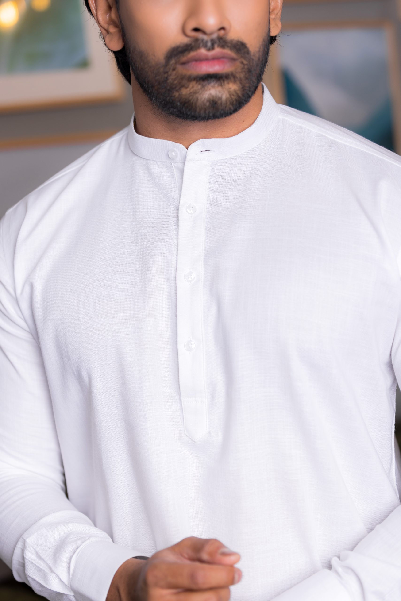 A masterclass in contemporary ethnic wear. The Alabaster Heritage Kurta reimagines a traditional silhouette with a sharp, modern minimalist aesthetic. Crafted from a premium micro-textured fabric, this piece offers a rich tactile dimension and a crisp, structured drape that stays polished throughout the day. Featuring a refined band collar and a clean partial-button placket, it strikes the perfect balance between cultural resonance and high-fashion sophistication. Whether styled for a formal ceremony or an intimate evening gathering, this Kurta is designed for the modern man who leads with grace and quiet confidence.