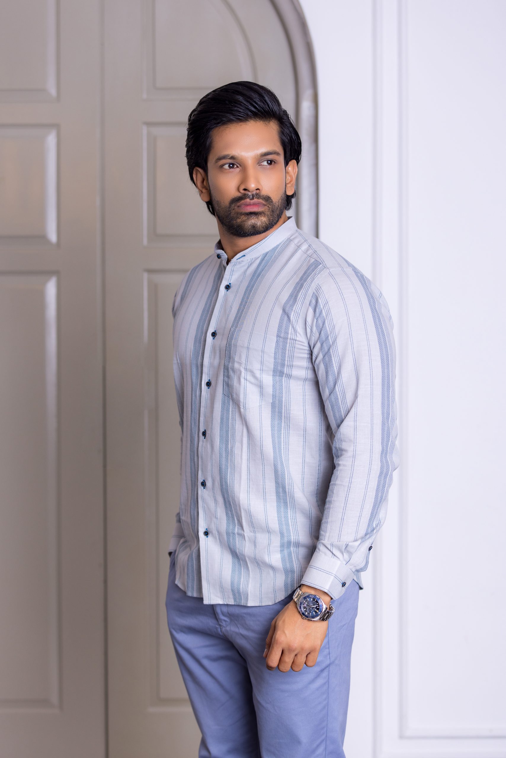 A contemporary take on a timeless classic. The Azure Stripe features a sophisticated Chinese collar and a dynamic multi-stripe pattern in varying shades of blue. The fabric is light and breathable, offering a soft texture that feels as good as it looks. With its clean, button-through front and relaxed yet sharp silhouette, this shirt is the perfect bridge between casual weekend wear and refined evening style. It’s a versatile essential for the man who prefers a modern, collarless edge.